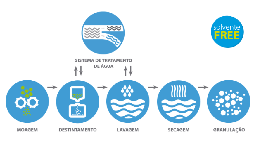 O processo de remoção de tintas foi desenvolvido com base na adição de produtos químicos a uma solução aquosa em um sistema de “circuito fechado” para a recuperação de água, sem qualquer uso de solventes ou produtos químicos prejudiciais ao meio ambiente. São 4 etapas até chegar à granulação: