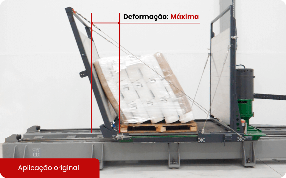 Como é percebido nas imagens abaixo, a deformação da carga com a aplicação original é 4 vezes maior do que a desenvolvida por nós, atestando o ganho de segurança em se envolver corretamente a carga.